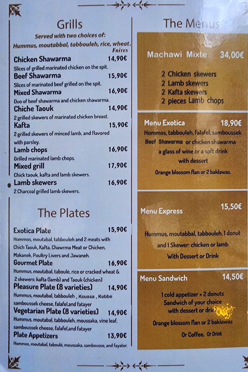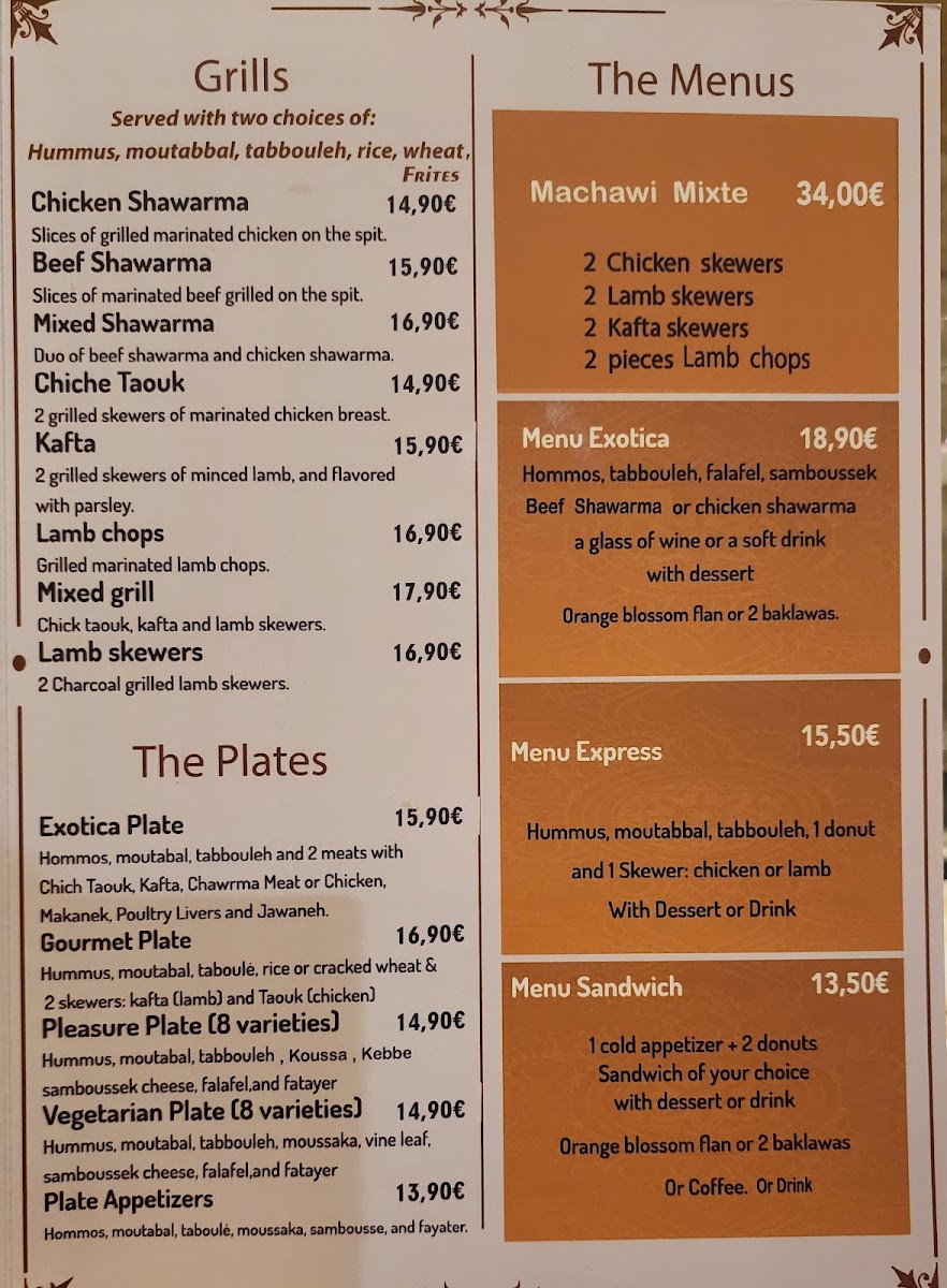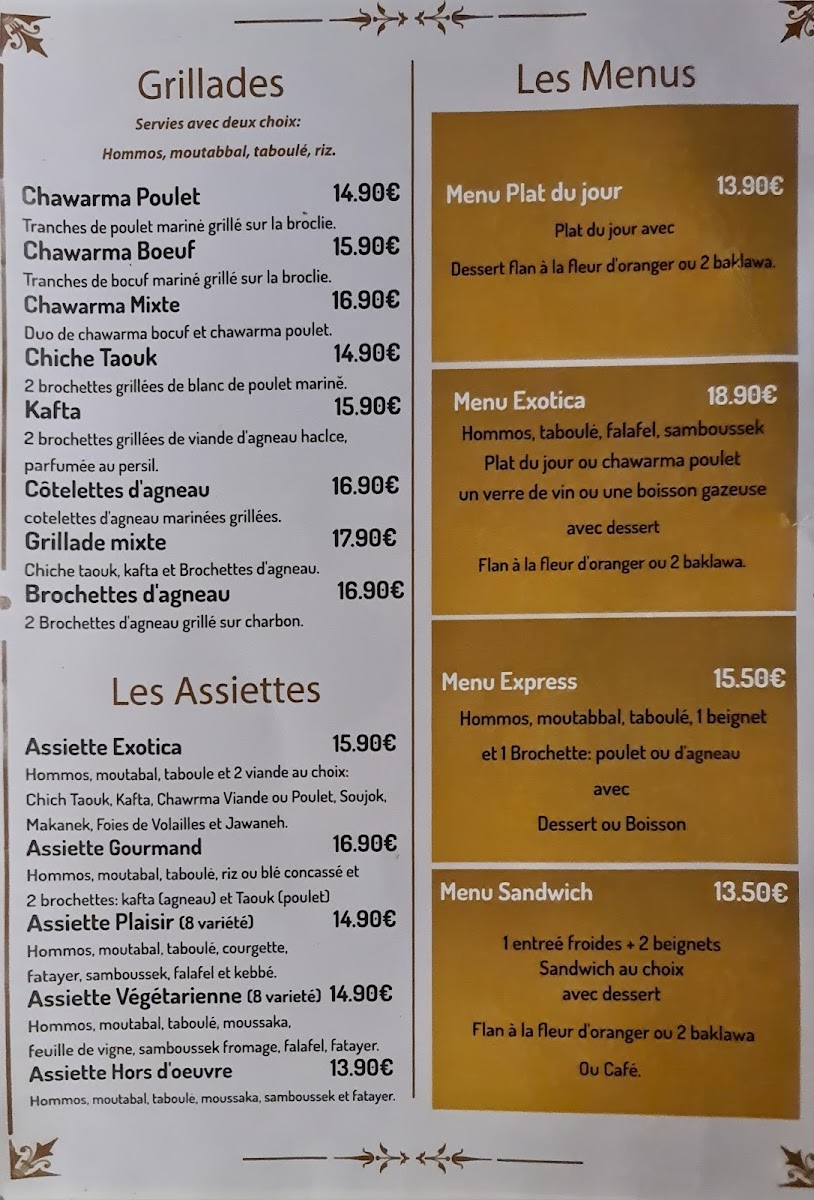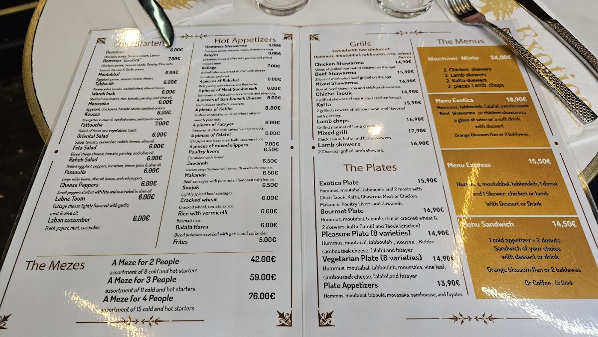 Exotica is a vibrant Lebanese and halal restaurant nestled in the heart of Paris, offering a rich palette of Mediterranean flavors. The menu masterfully blends traditional Lebanese dishes with fresh, aromatic ingredients, making it a haven for both meat lovers and vegetarians alike. Start your culinary journey with their cold entrées like the creamy Hommos Exotica, a delightful twist on classic chickpea purée infused with harissa and garlic cream, or the zesty Tabboulé bursting with parsley and lemon.